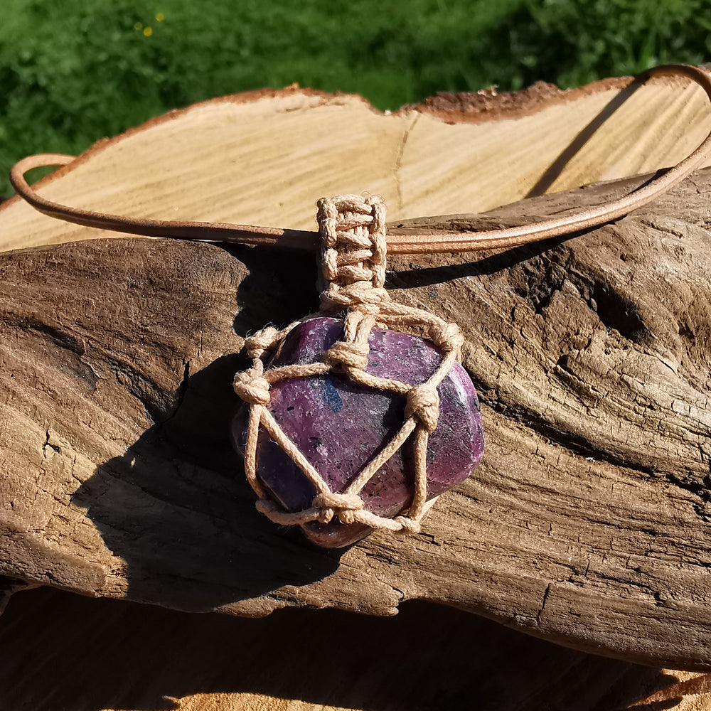 Handpolierter Rubin in Baumwolle gewachst geflochten. Bei uns im Atelier in der Schweiz eingeflochten.