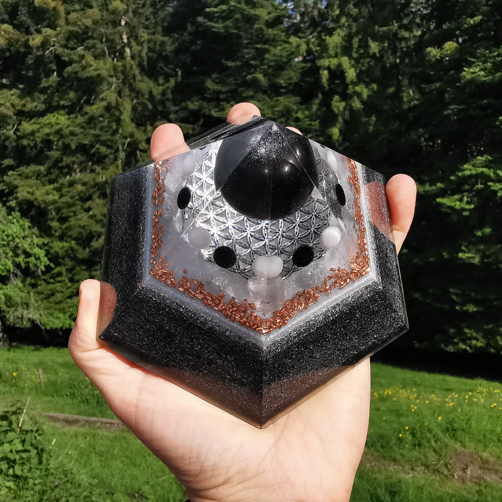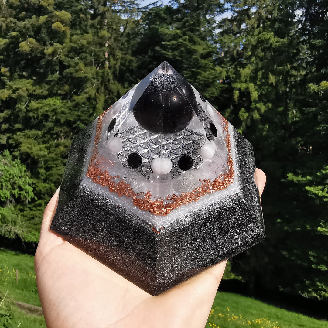 Hexagonale Pyramiden basieren auf dem Seckseck. Sie symbolisieren die Vollständigkeit und Harmonie der Natur, aber auch Stabilität und Struktur sowie die Manifestation des Geistigen auf der materiellen Ebene. Also die Auswirkung und Anerkennung der geistigen Gesetze in der Materie hier auf der Erde. → Sie steht zudem für die sechs Richtungen (N, S, O, W, oben, unten) und spirituellen Aufstieg.