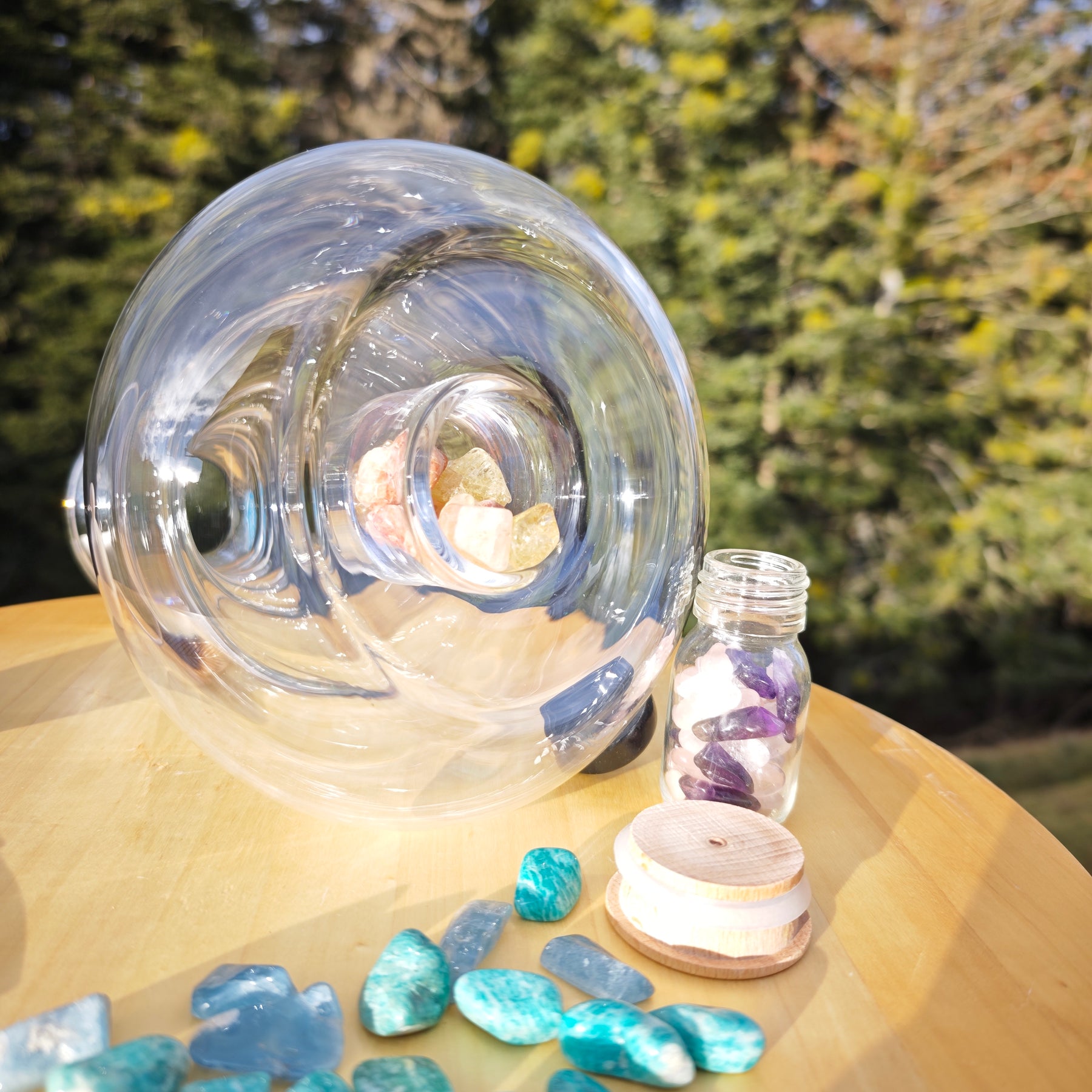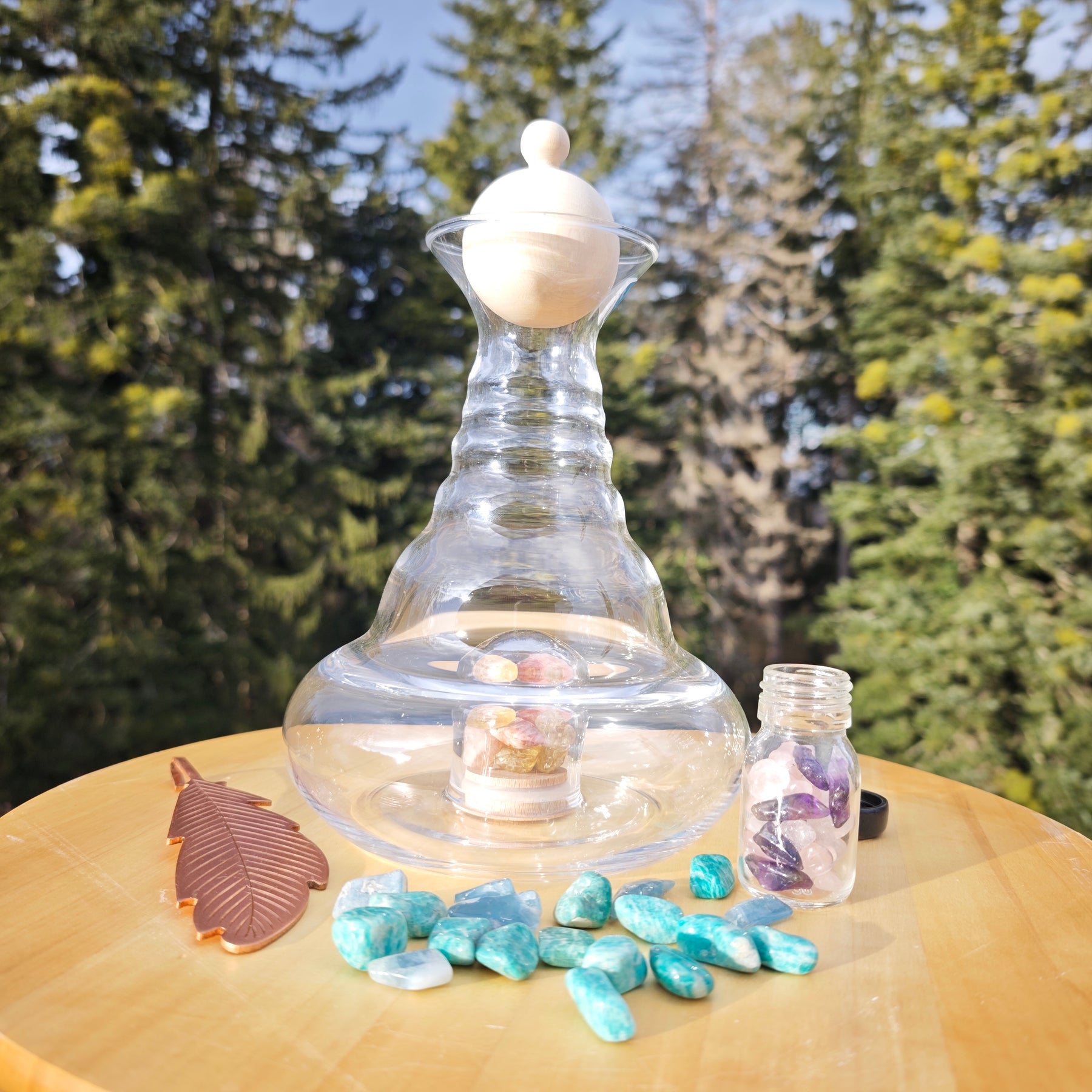 Im Boden der Karaffe befindet sich eine verschliessbare Einbuchtung zum Einsetzen von Edelsteinen. Hier bringt das Wasser durch den Lupeneffekt die Schönheit der Steine wunderbar zur Geltung.