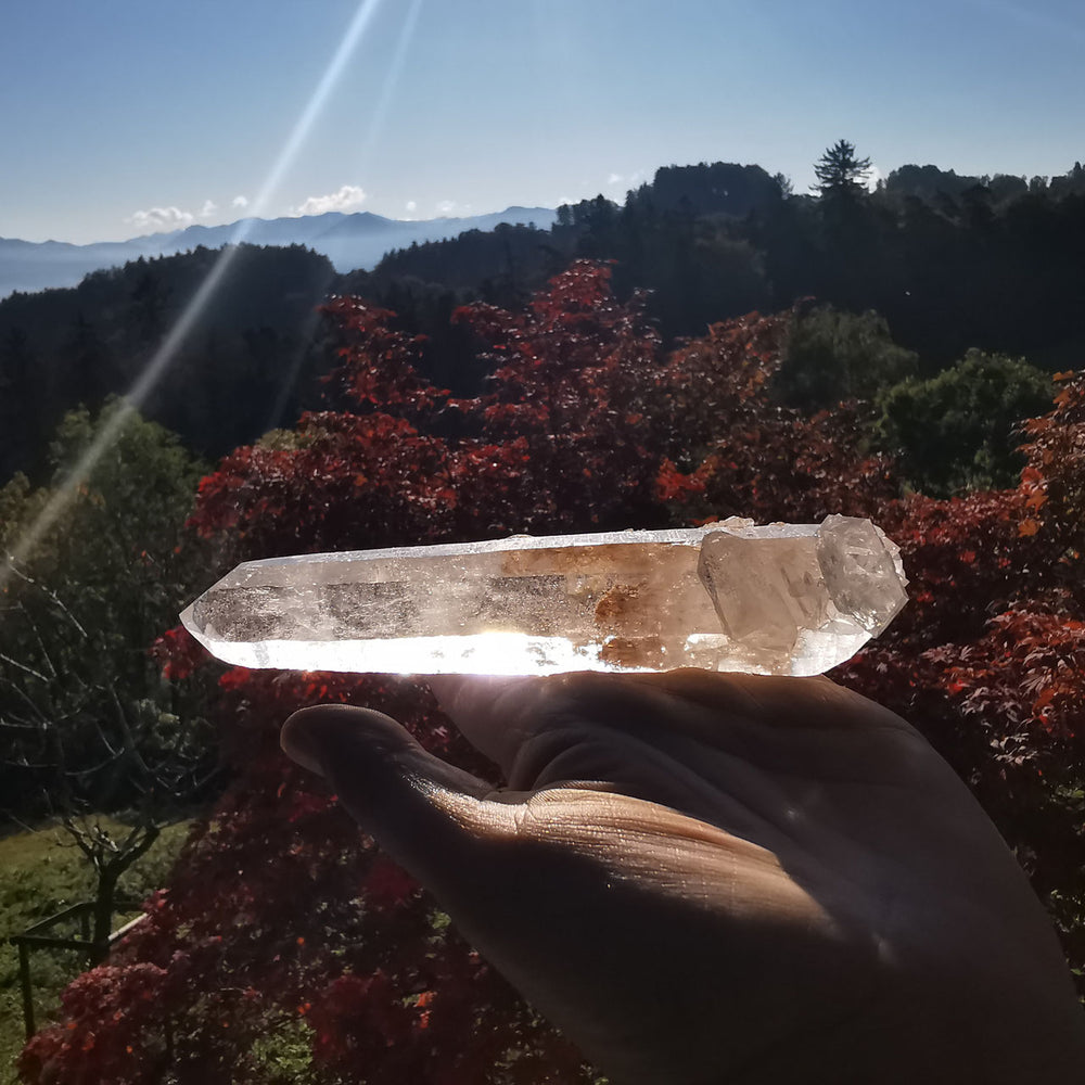 Doppelender Speicherquarz in hoher, sehr klarer Qualität aus dem Himalaya. Im Kristall ist das ganze Spektrum des Lichts gespeichert.