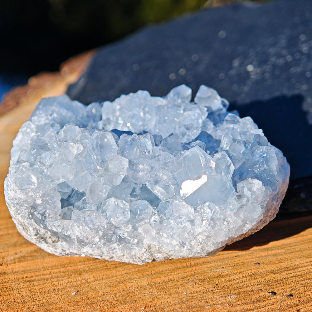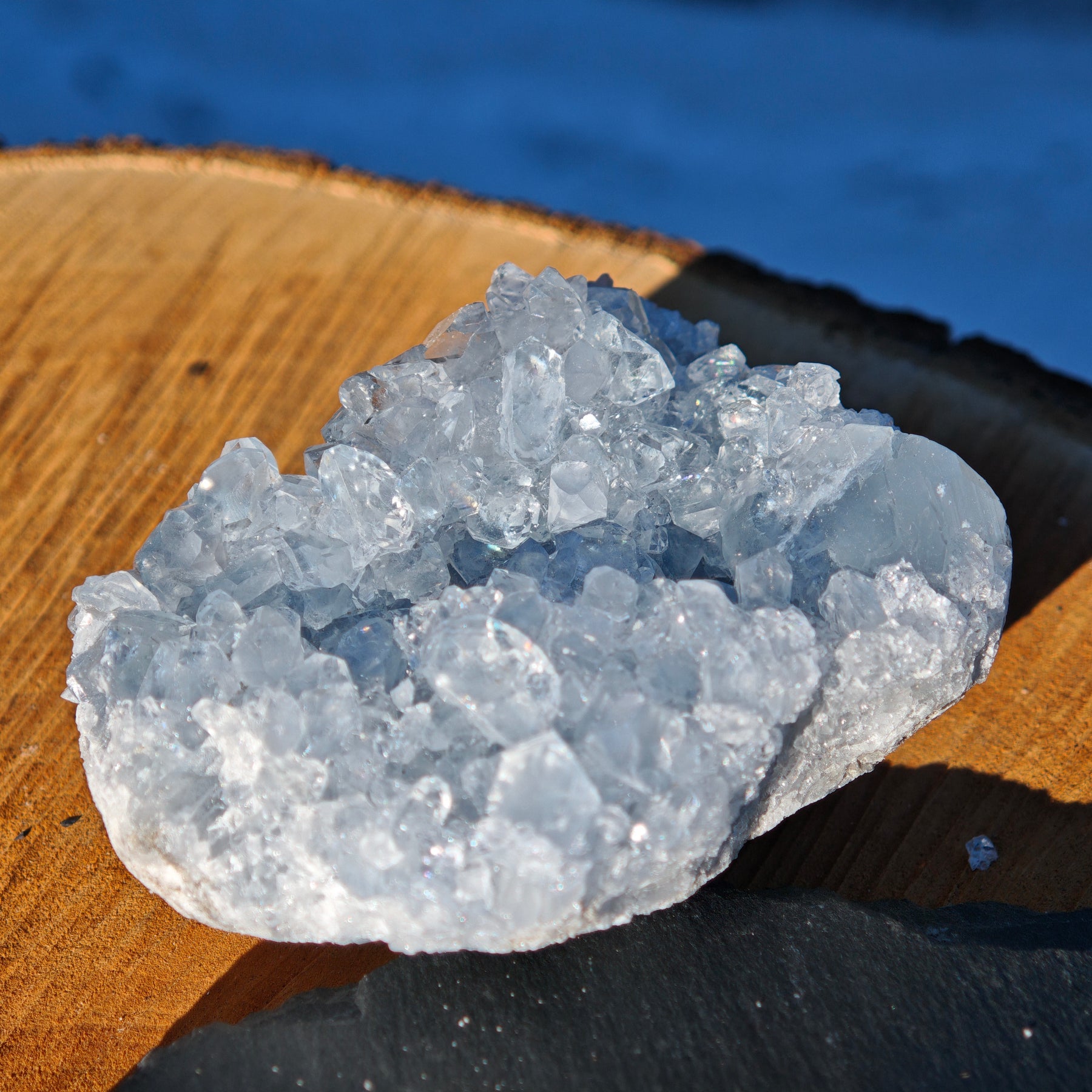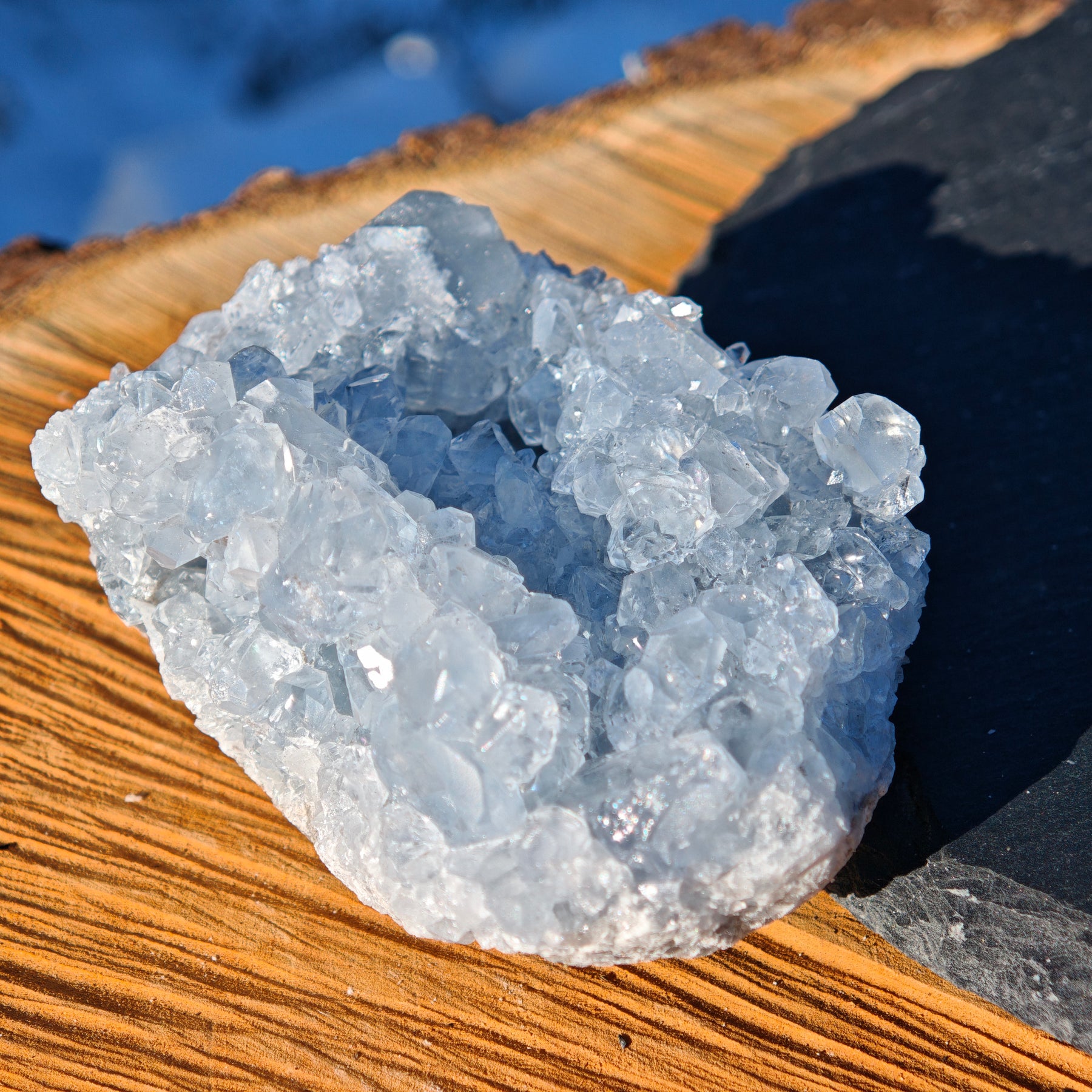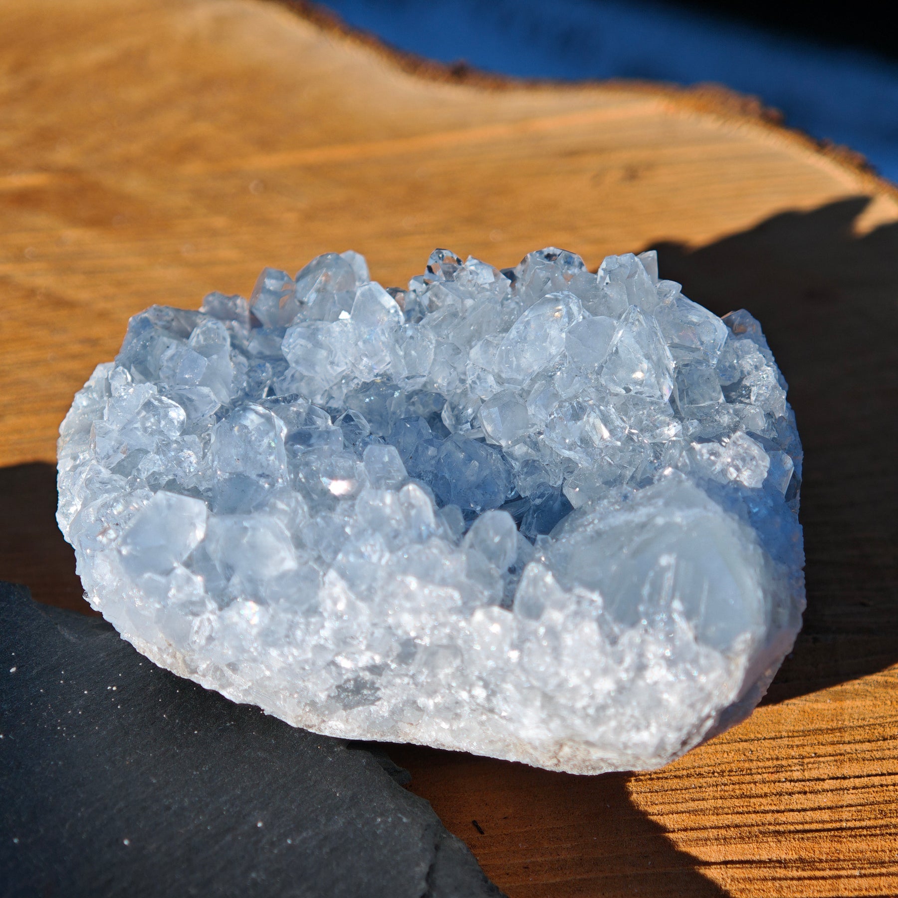 Der blaue Coelestin eignet sich für alle geistigen Aktivitäten, insbesondere um reale Probleme zu analysieren. Besonders hilft er dabei ein Problem, eine Situation oder eine Vorstellung in seiner ganzen Weite zu überblicken. Besonders zu erwähnen sind seine abschirmenden und reinigenden Eigenschaften auf die Chakren und die Aura welche durch ihn ausgeglichen, klar und rein werden. Der Coelestin kann als Hoffnungsstrahl in düsteren Tagen wirken weil er Ruhe und Harmonie ins Leben bringt. Er vermag Schmerz und Chaos in Licht und Liebe zu verwandeln. Wir können aufhören, uns Sorgen zu machen, können uns frei bewegen und immaterielle Werte mit einem klaren und zufriedenen Geist verfolgen. Coelestin verfügt über eine innere Weisheit und hat seinem Benutzer etwas zu erzählen. Das Wissen des Steins hilft meist in spirituellen Bereichen und dient unserer Vervollkommnung. Er eignet sich ausgezeichnet für Astralreisen und die Traumerinnerungsarbeit weshalb ich einen Coelestin im Schlafzimmer oder zur Meditation nur empfehlen kann.