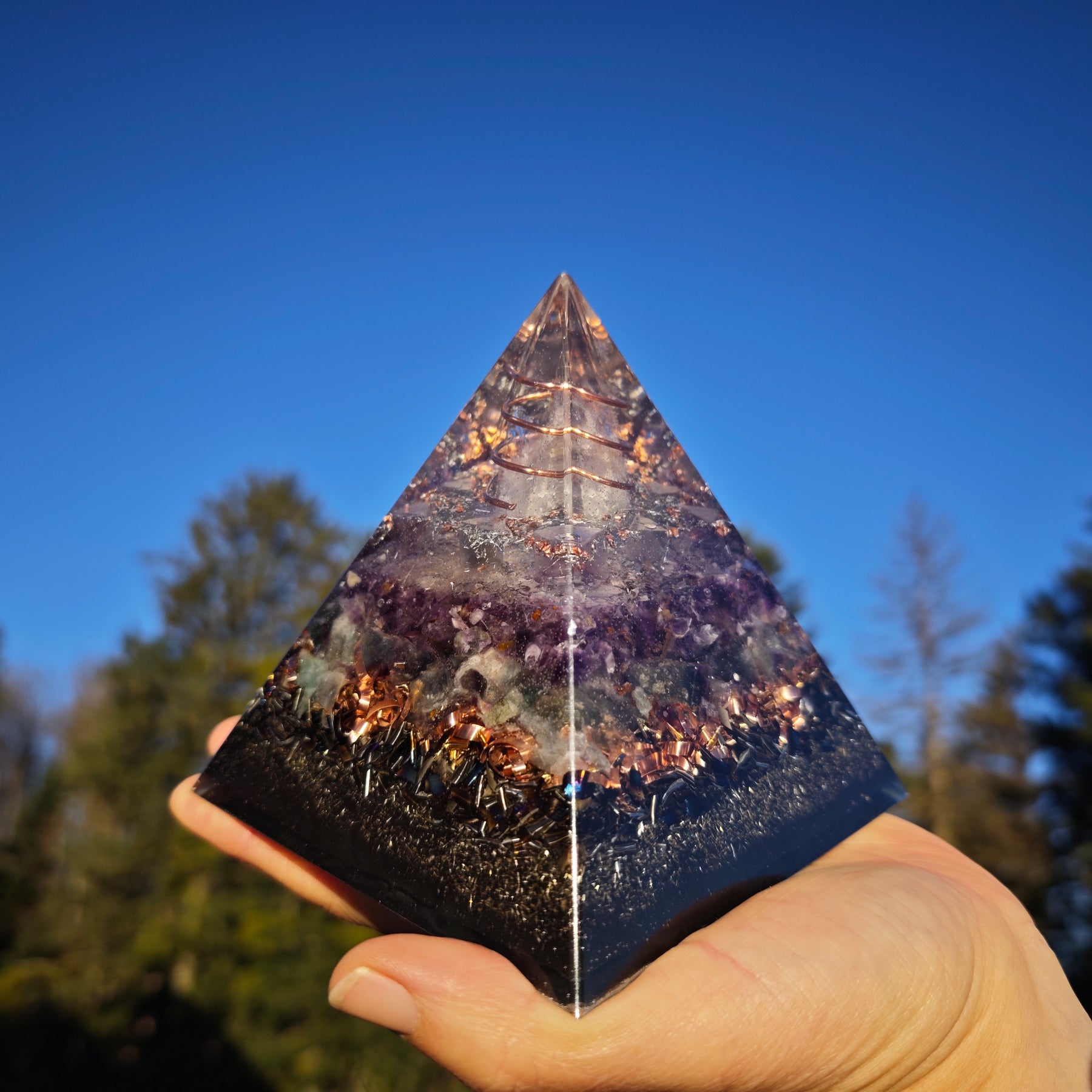Enthält: Bergkristallspitze in Kupferspirale, 8 Fluoritoktaeder natürlich gewachsen, violetter Fluorit & Regenbogenfluorit, Kupfer-, Bronce- & Edelstahlspäne, Pigment, Selenit, Schwarzer Turmalin, Schungit