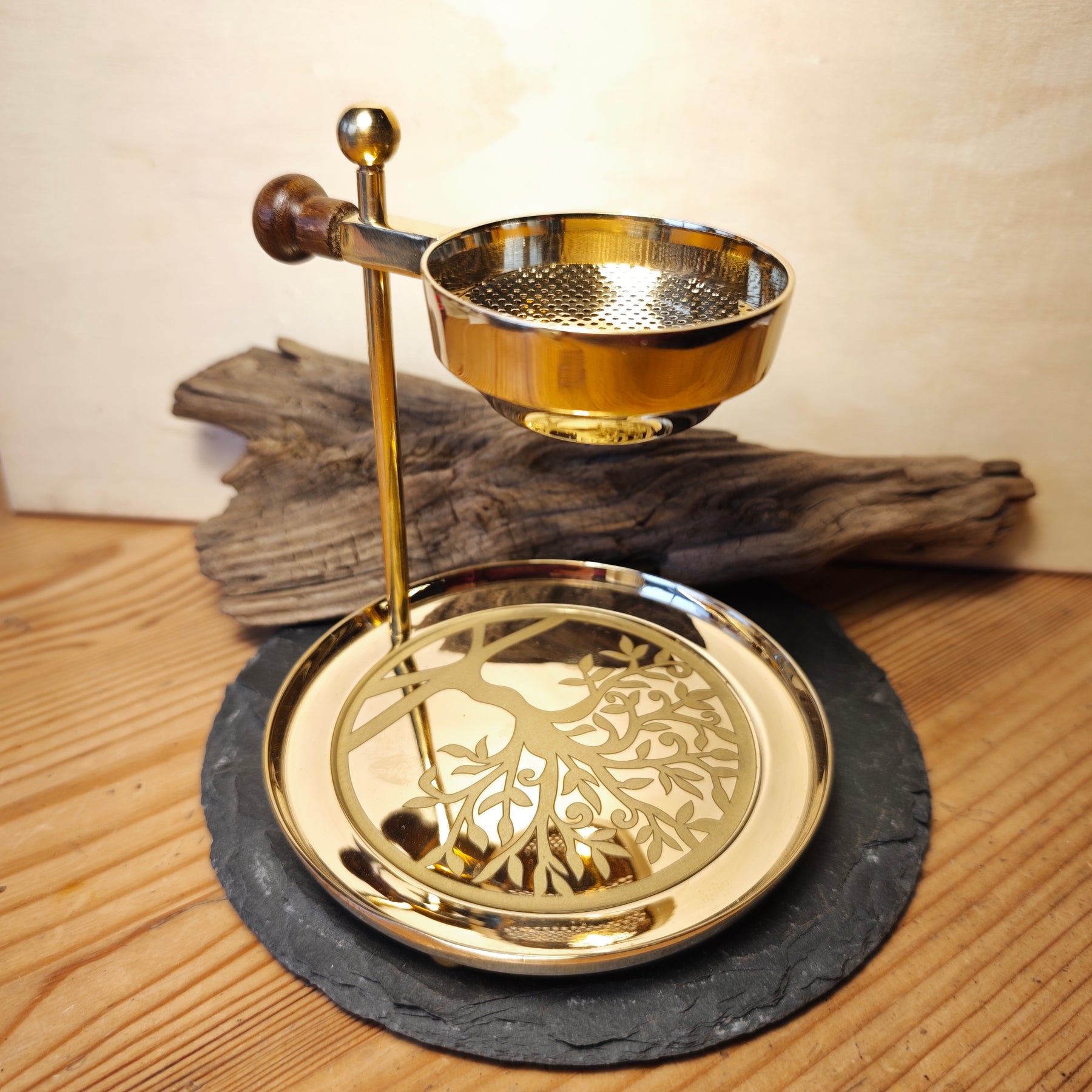 Das Räucherstövchen besteht aus Messing mit einer grossen Bodenplatte in welcher der Baum des Lebens eingraviert wurde.